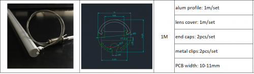 Contents: 1pc 1m length alum channels, 1pc clear/milky/frosted lense cover for options,2pcs metal clips, 2pcs plastic end capsule suitable for 10-11mm width PCB board