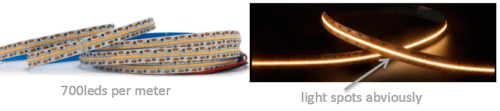Normal smd LED strip light is always being with 120º beam angle only, even people could make it in high density like 700pcs SMD2110 per meter as below,which you can still find the light spots obviously.