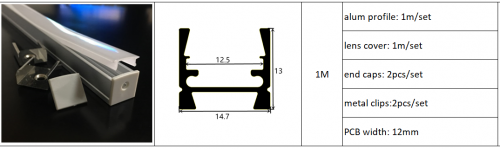 Contents: 1pc 1m length alum channels, 1pc clear/milky/frosted lense cover for options,2pcs metal clips, 2pcs plastic/metal end capsules suitable for 12mm width PCB board